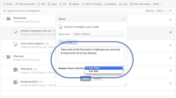 Changes to the document generate updates visible to space members in the form of automatically generated comments below the document posting on the activity stream. Participants can then easily interact around the document and its changes, and they are notified of new updates or mentions.