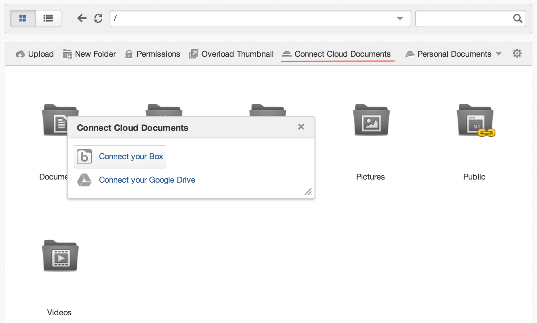 Each Platform user has their own Personal Documents. This folder is open by default in the Documents app. With Cloud Drive installed, a “Connect Cloud Documents” action appears. It is available in each view of the Documents app. Currently, you can connect to either Google Drive or Box.