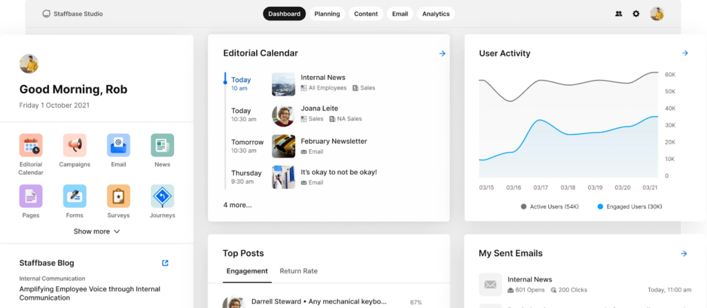 Staffbase specializes in top-down communication across a dispersed workforce, making it a strong contender for businesses with many frontline or non-desk employees. It supports multiple touchpoints: app, desktop, email, and even digital signage.