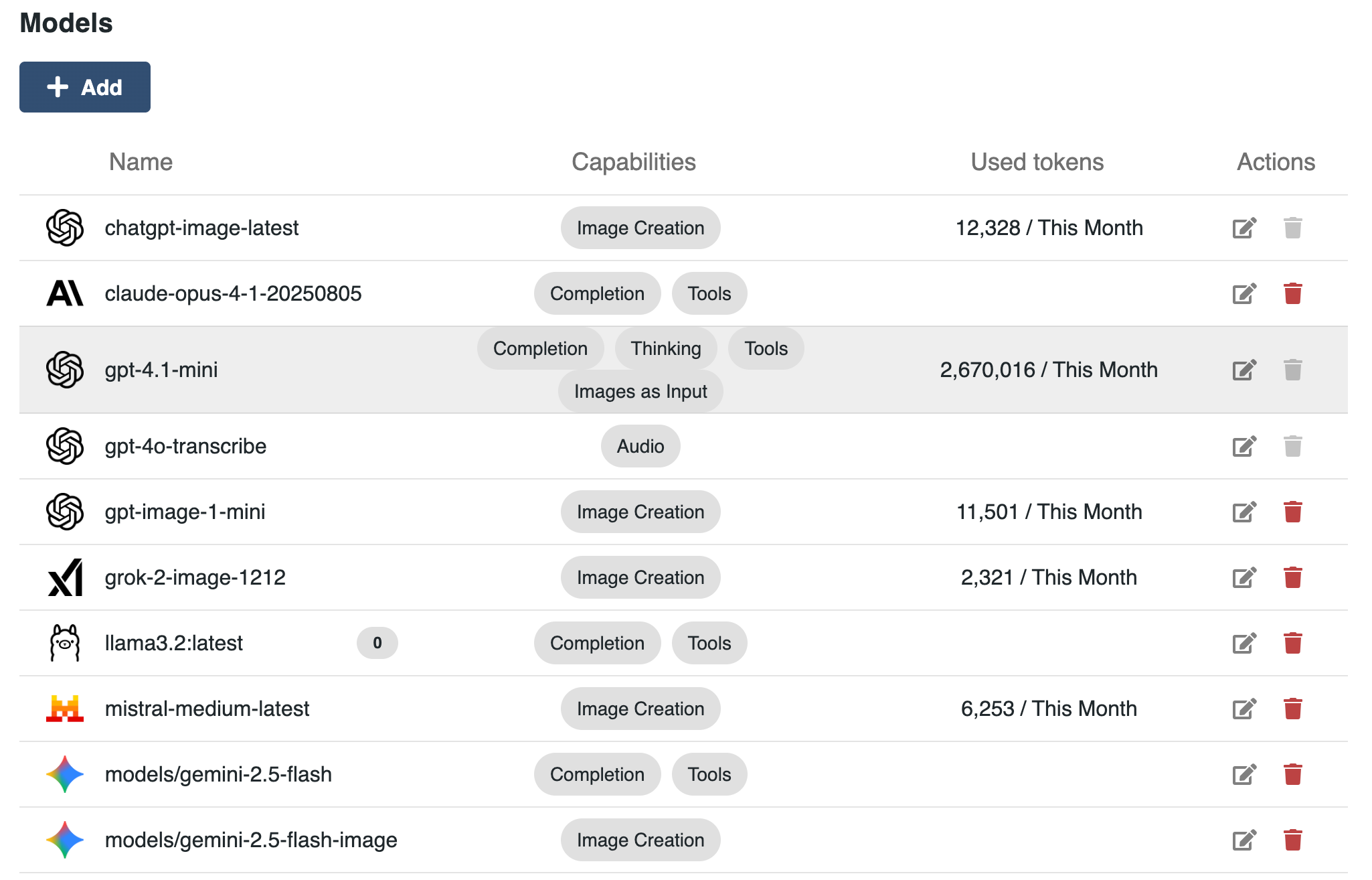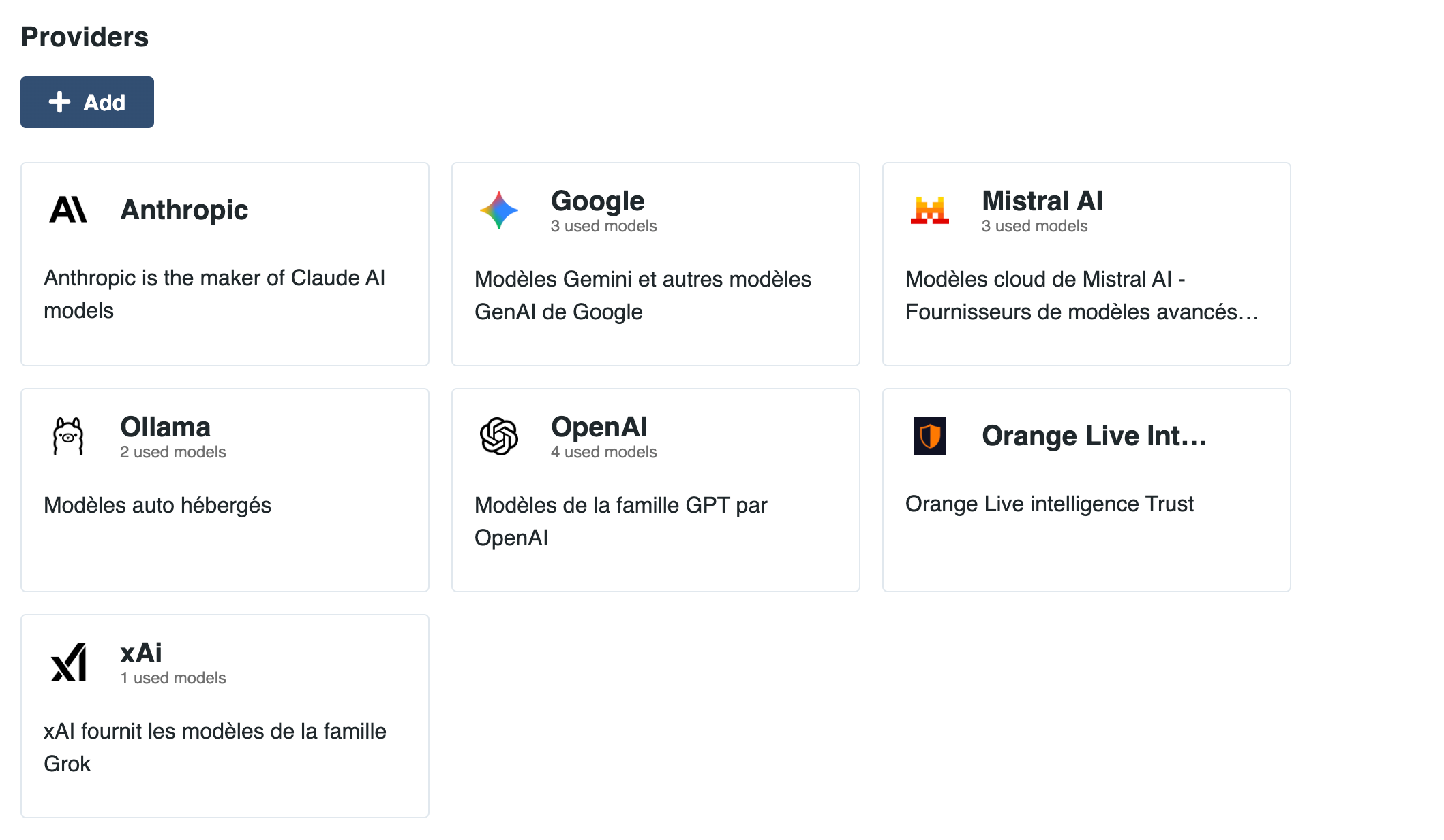 The platform supports multiple providers, from commercial AI services to open-source and self-hosted models.