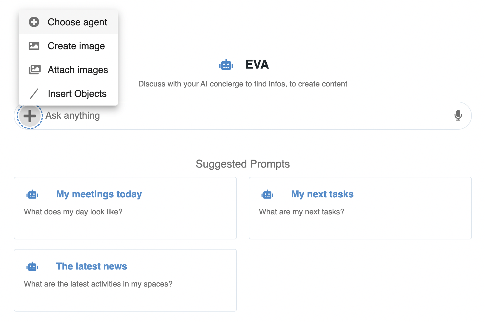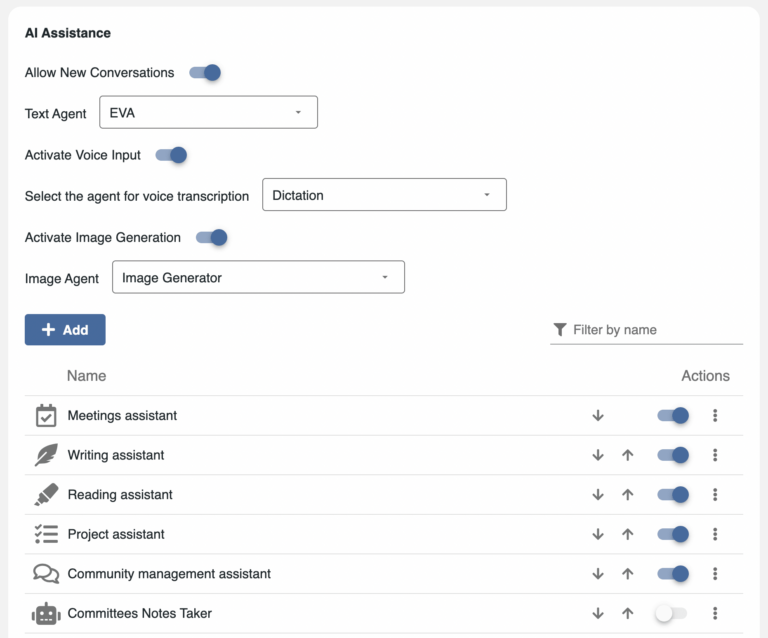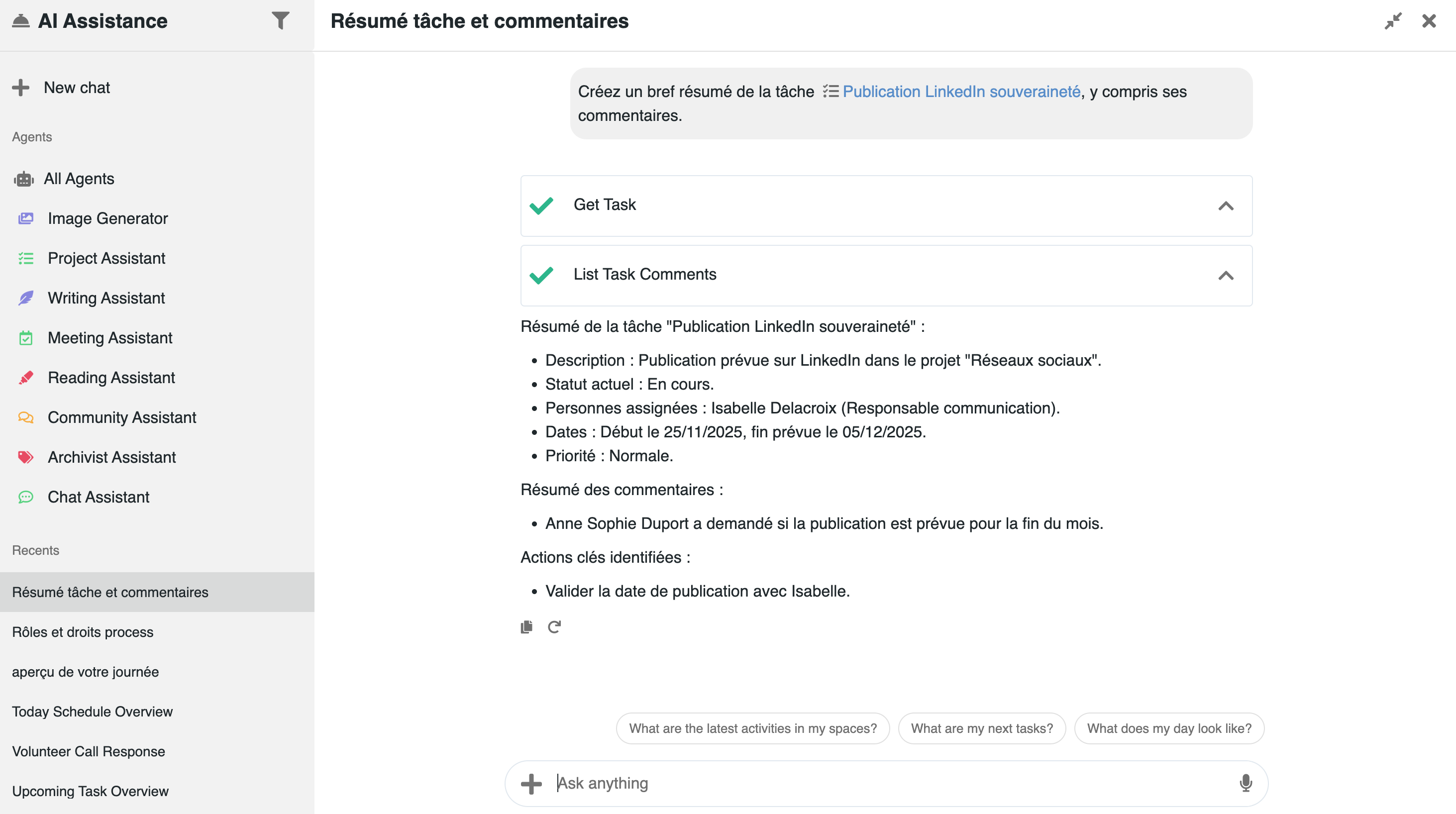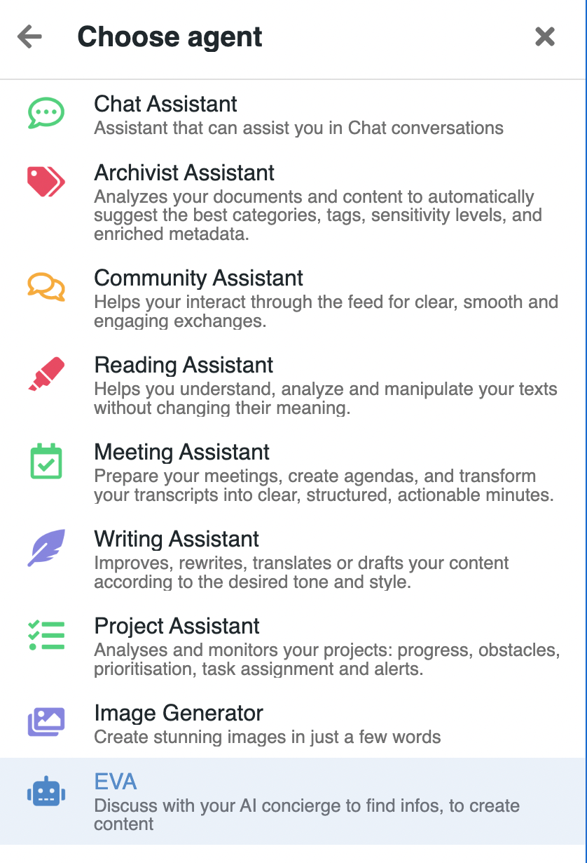 AI assistants can be invoked through contextual AI actions, configured with prompts and triggered directly on specific elements of the platform, such as tasks, documents, posts or events.