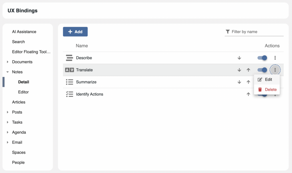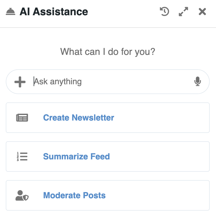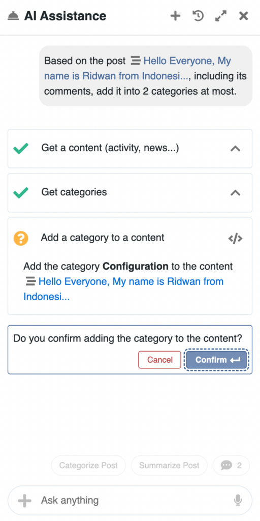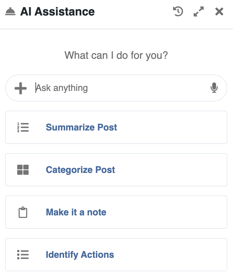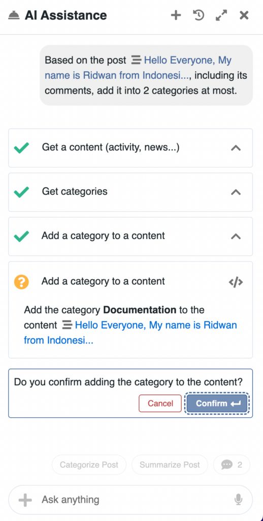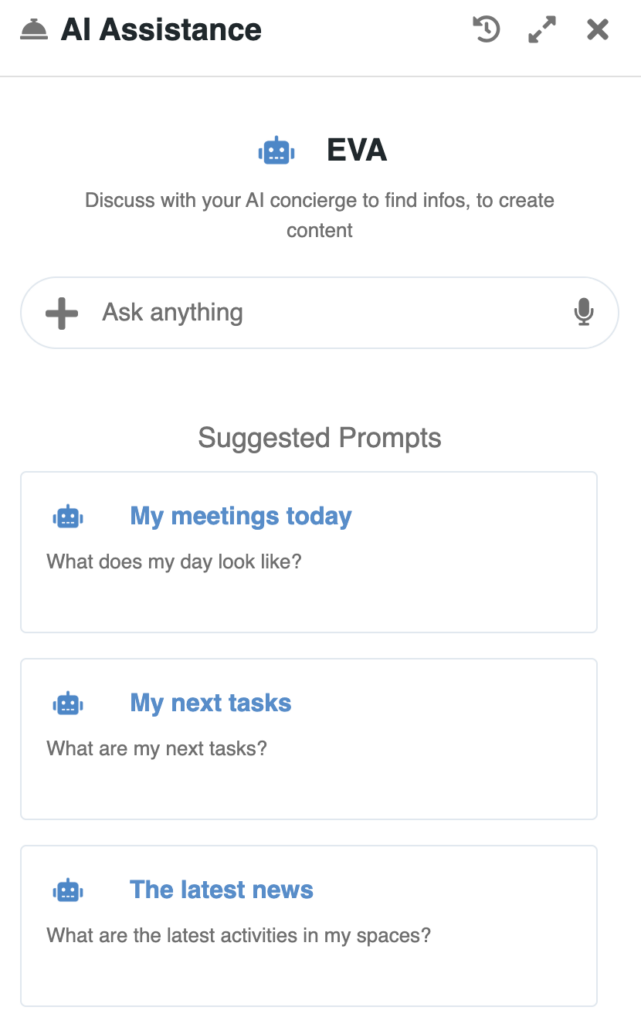 AI assistants can be invoked through contextual AI actions, configured with prompts and triggered directly on specific elements of the platform, such as tasks, documents, posts or events.