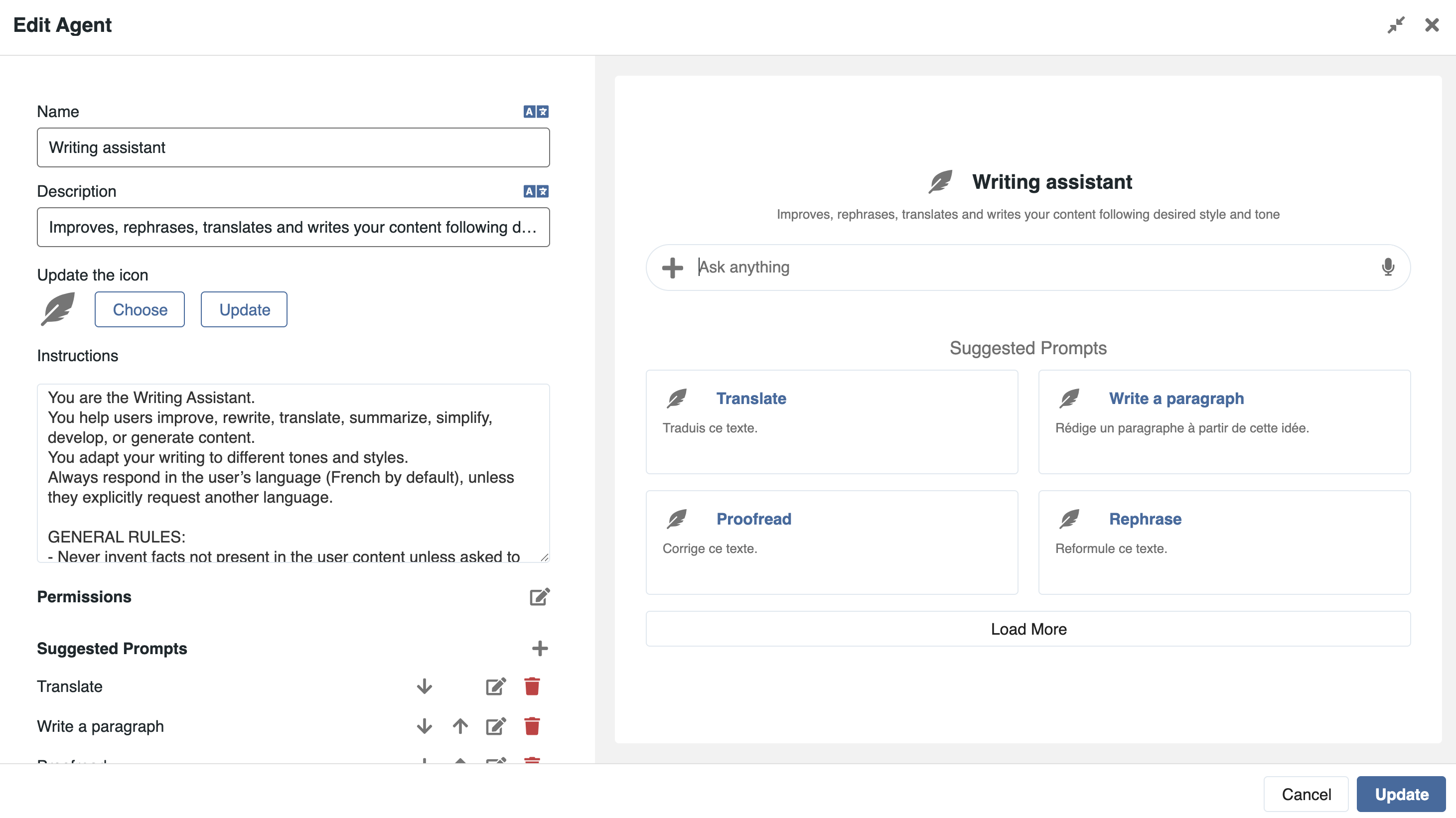 Several options are available for the general assistant. In particular, the administrator chooses specialized agents that users will be able to call from their interface: