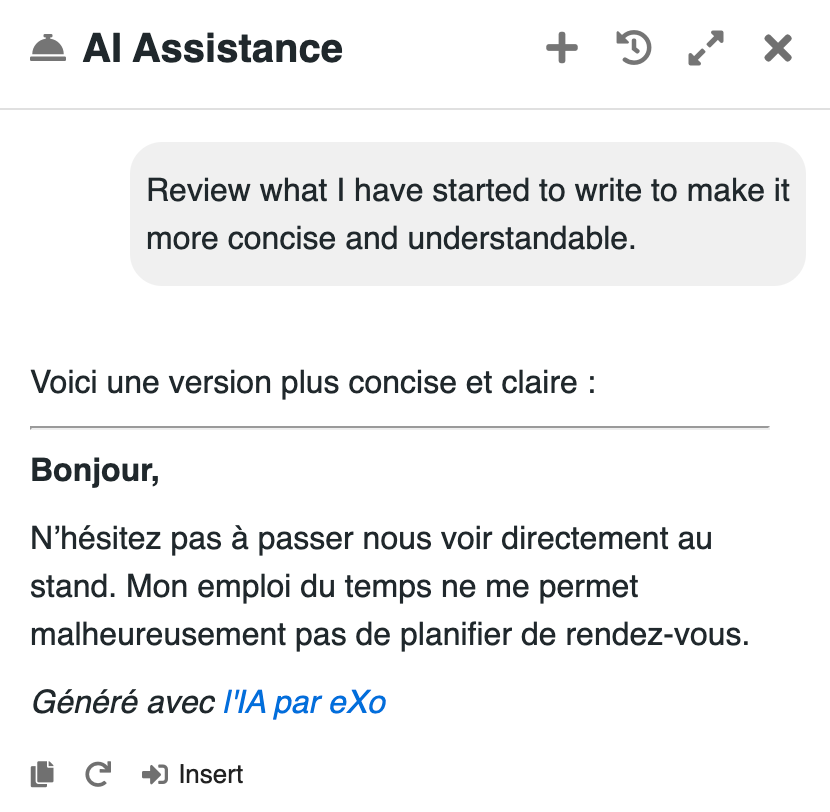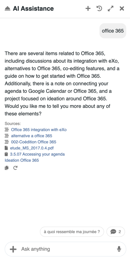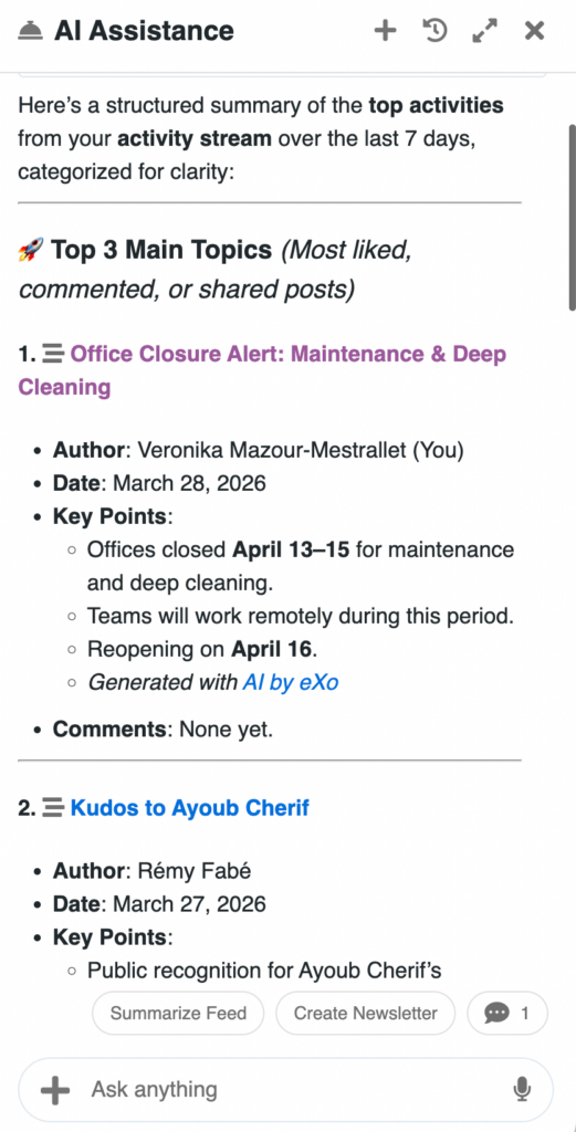 Beyond content creation, AI in eXo helps users navigate and make sense of information across the platform.