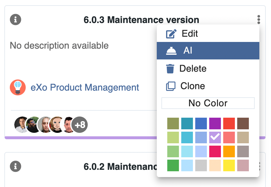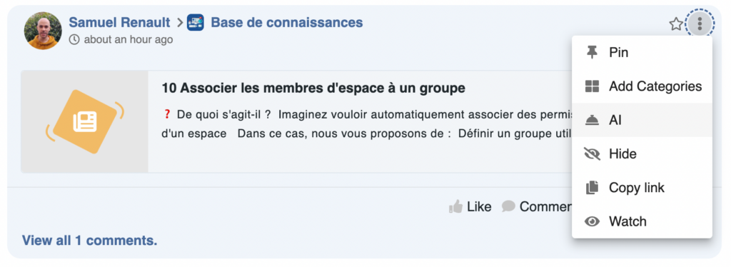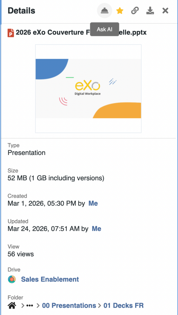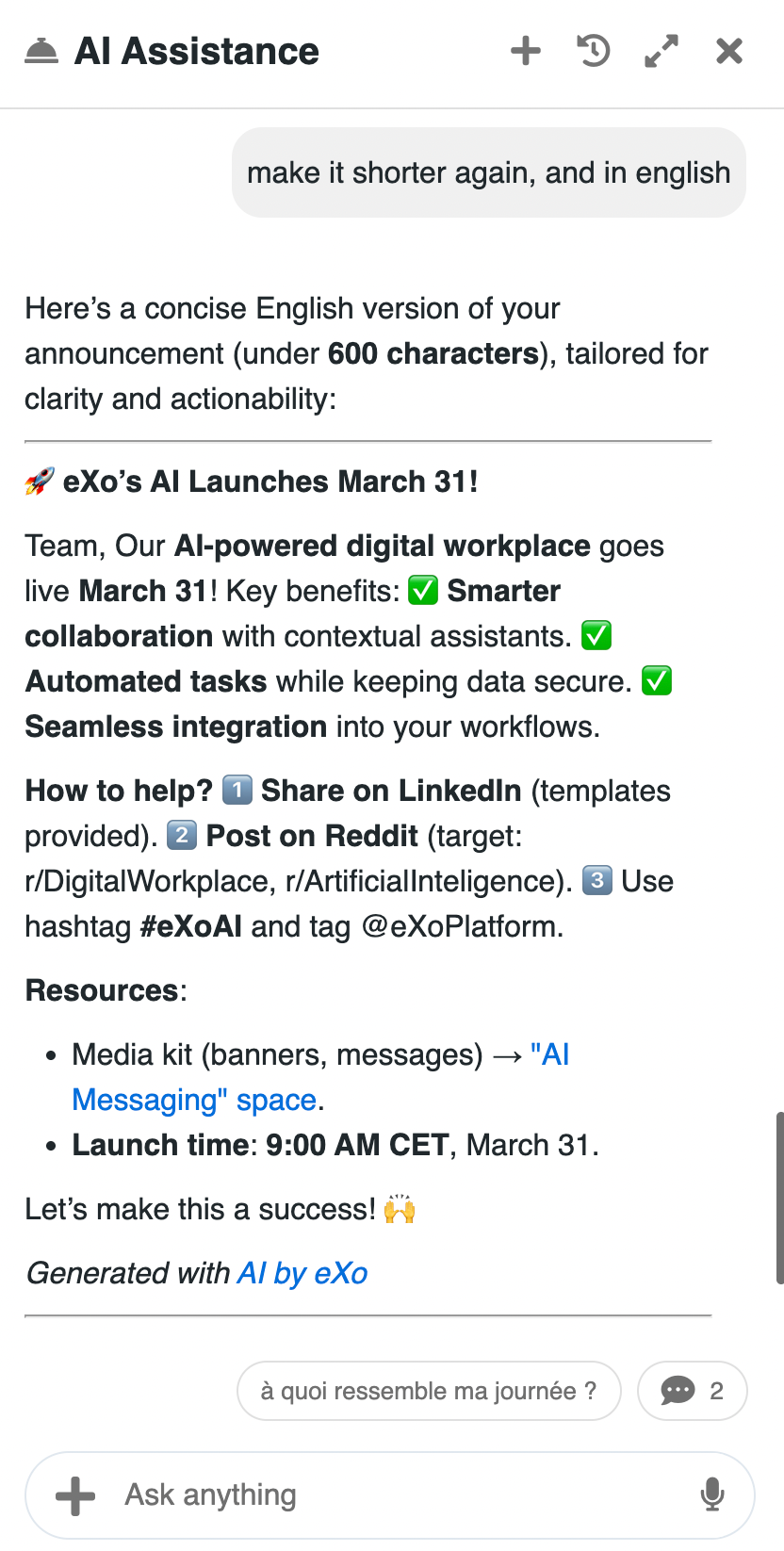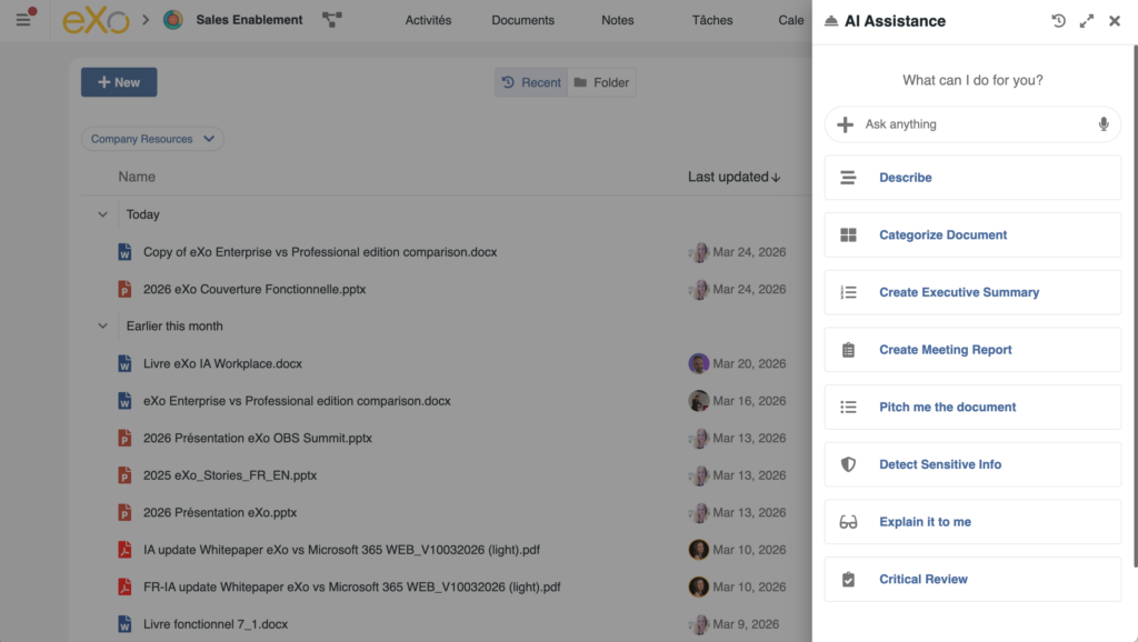 To make this even easier, eXo provides preconfigured, one-click prompts directly accessible in the interface, and adapted to the user’s context. Depending on where the user is, AI suggests relevant actions. For example: