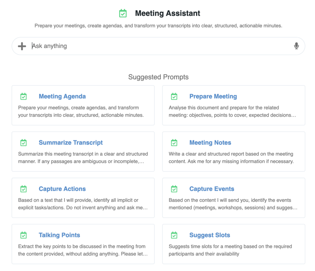 These actions allow users to automate and standardize common workflows, making it easier to carry out repetitive tasks such as generating structured meeting agendas, producing activity reports or monitoring project progress.