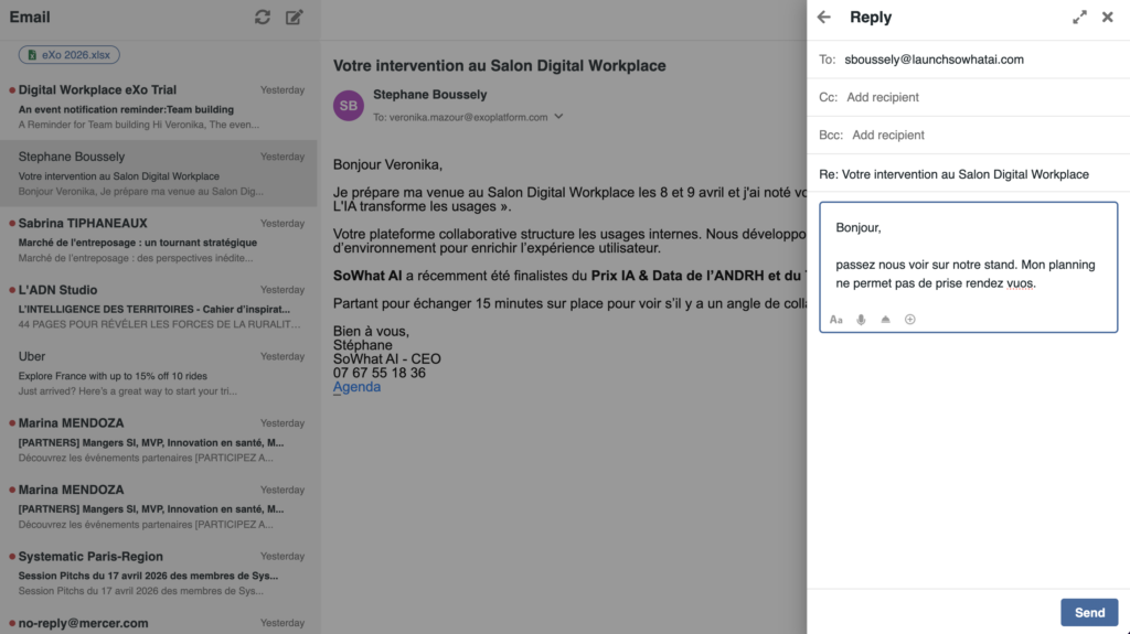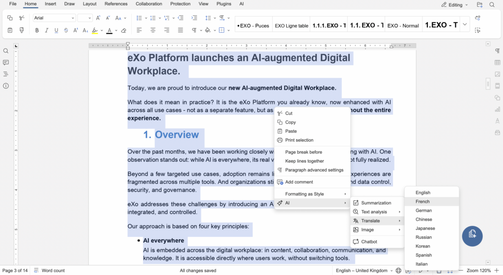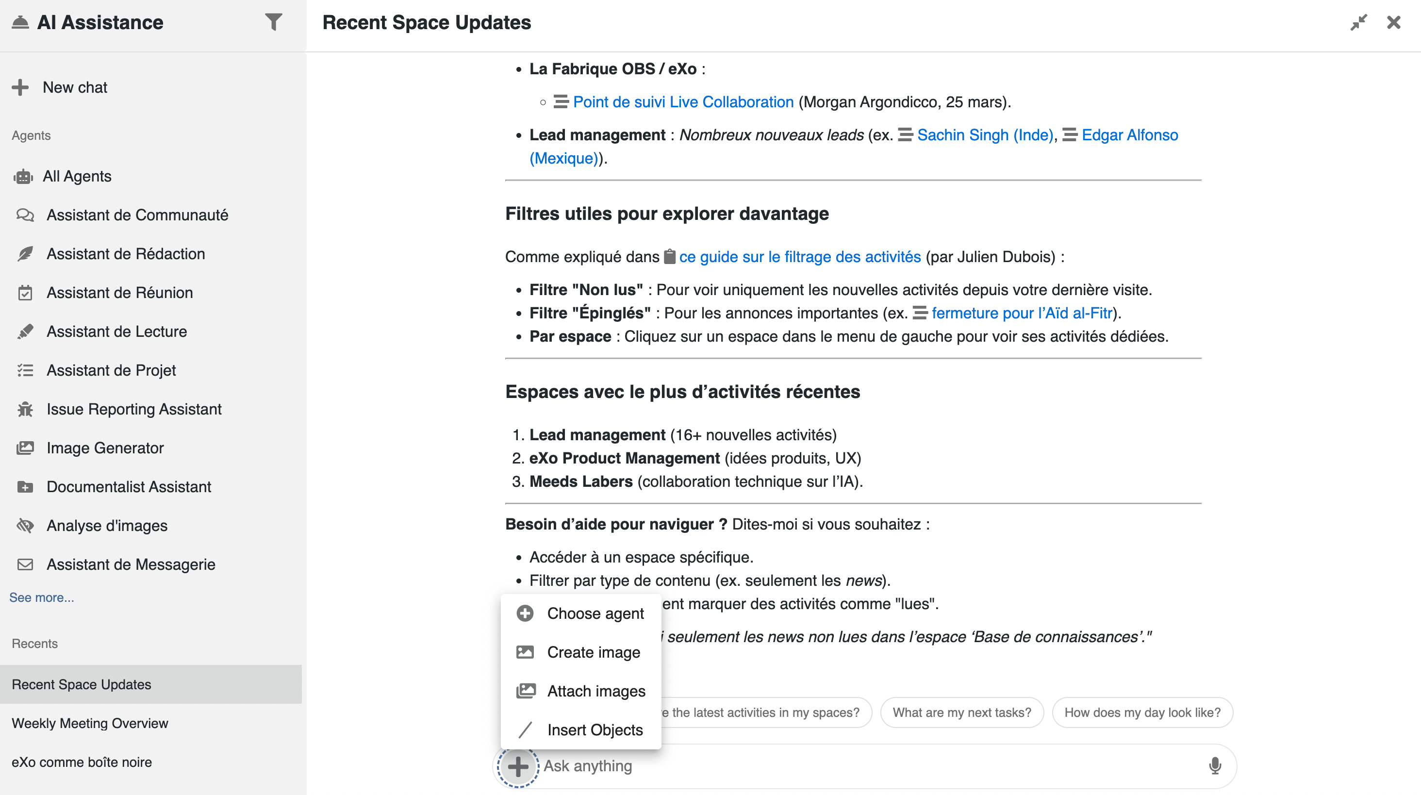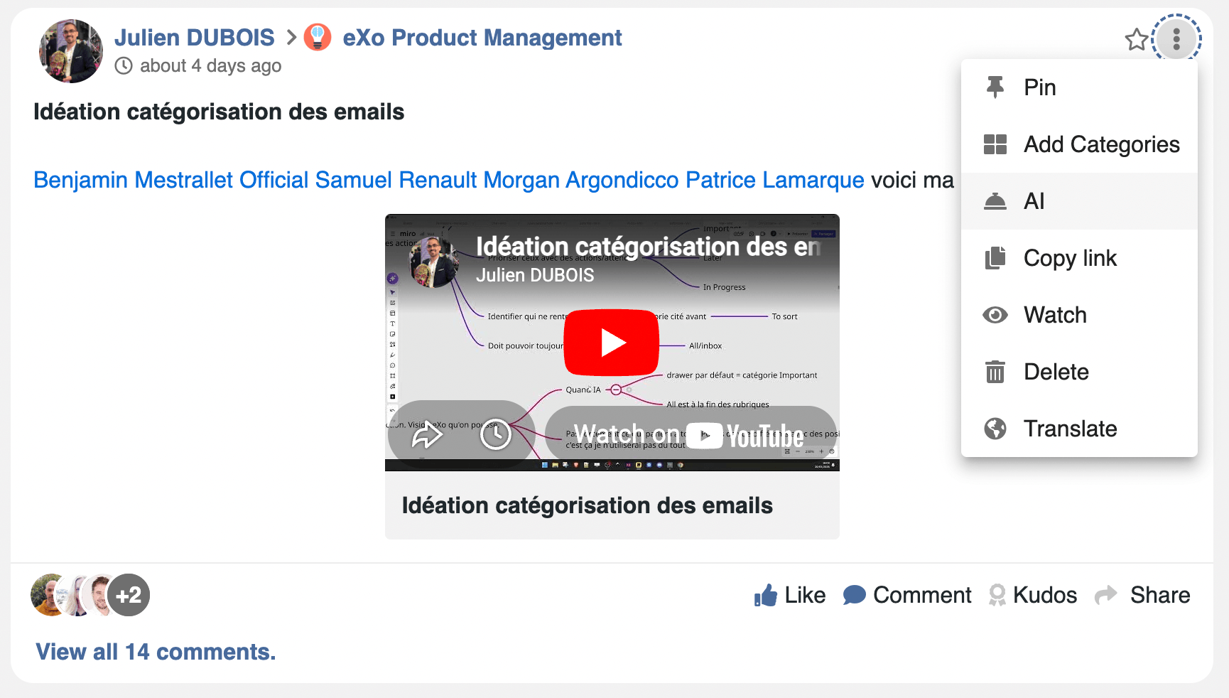 Behind this unified access, eXo relies on contextual AI agents. Each time AI is invoked: