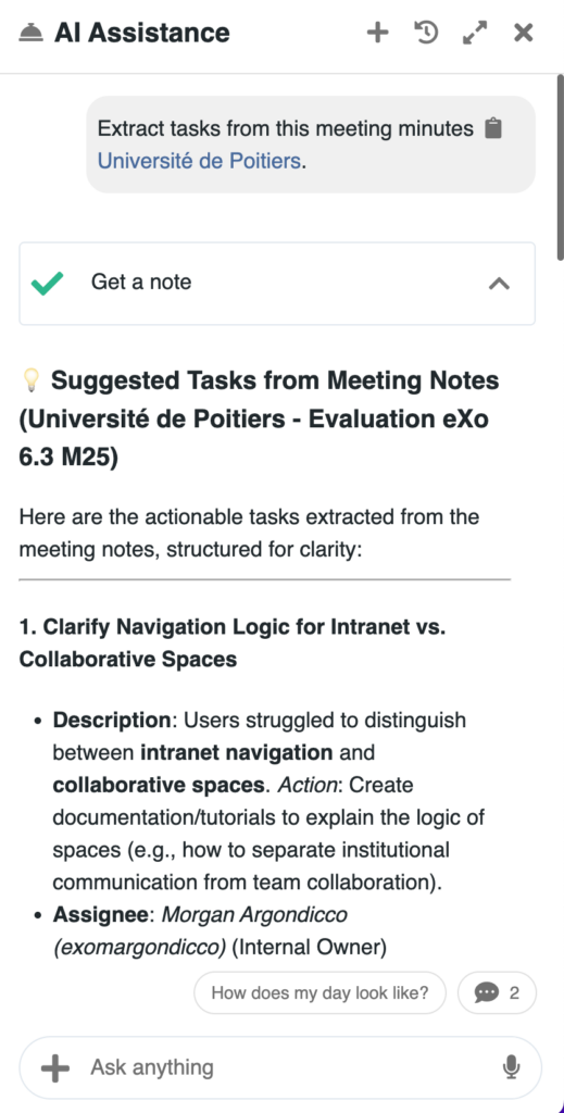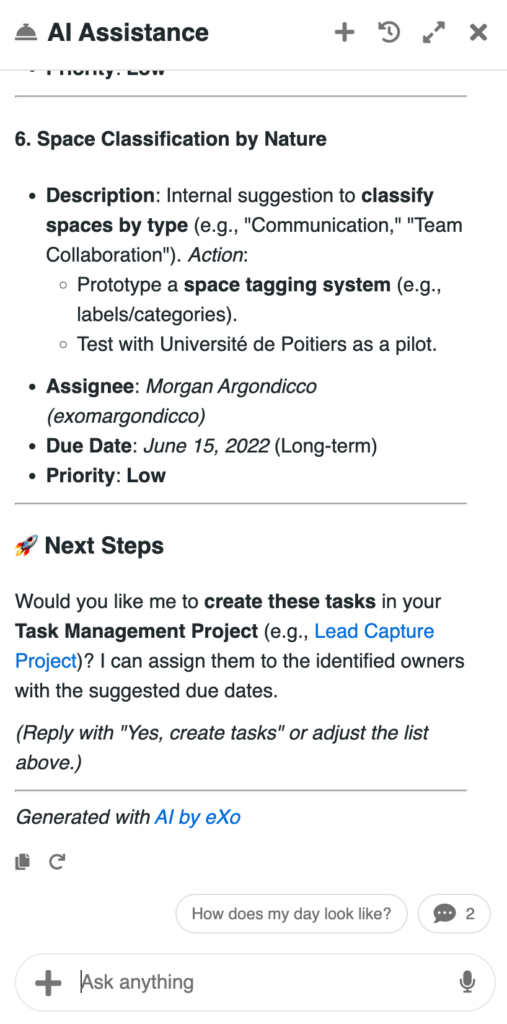 Beyond helping users write or understand information, AI in eXo supports a more advanced objective: turning information into action.