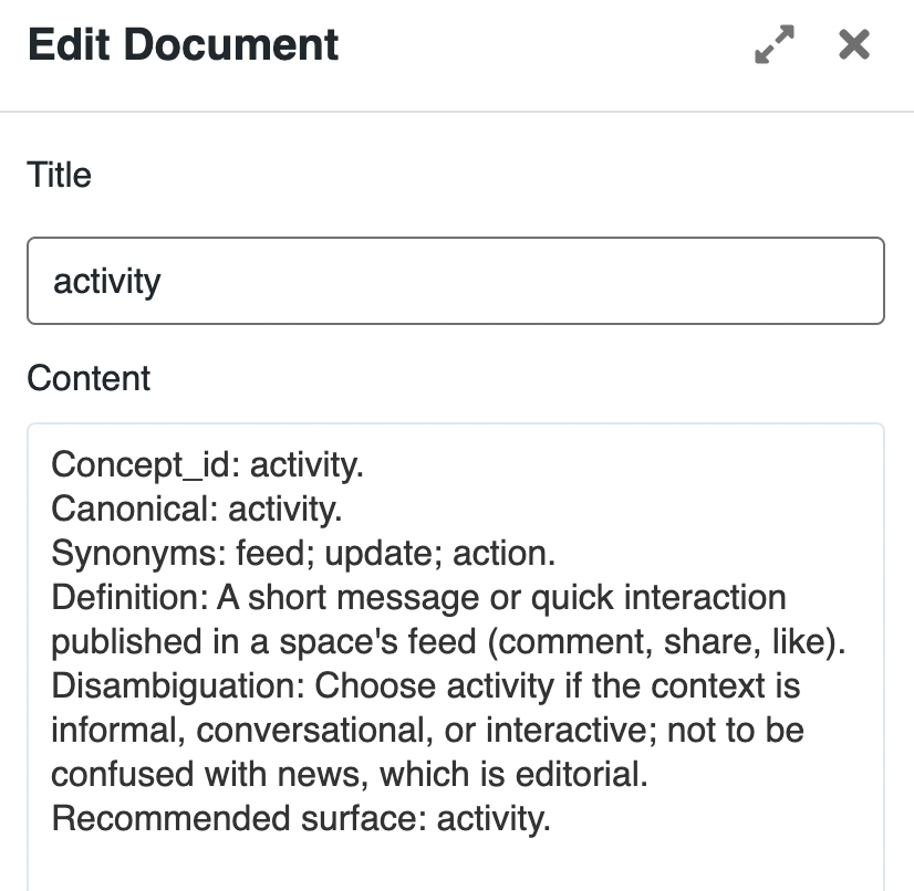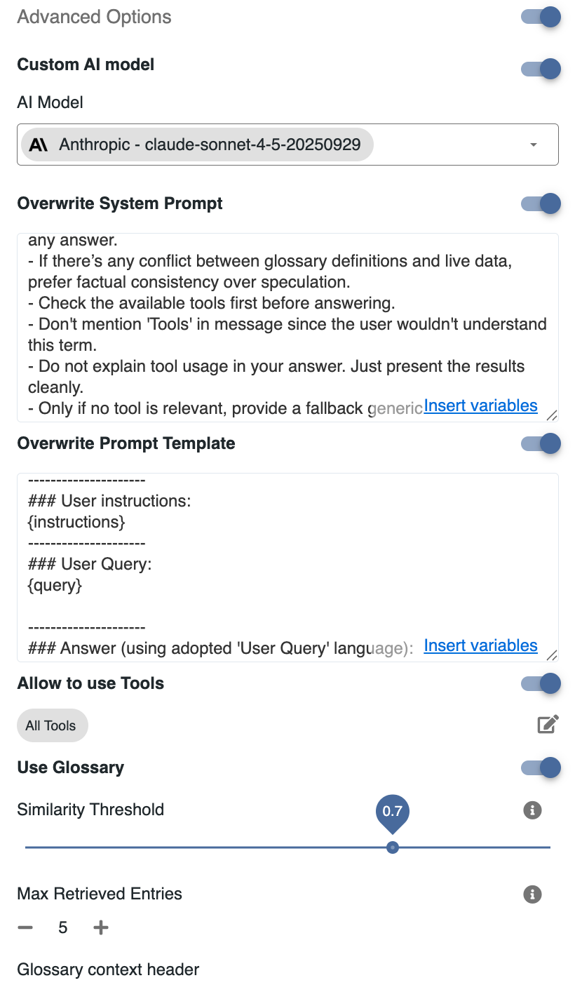 AI can also leverage complementary sources of context to improve consistency and relevance, in particular an organizational glossary. The latter can be managed by the organization through the administration interface: