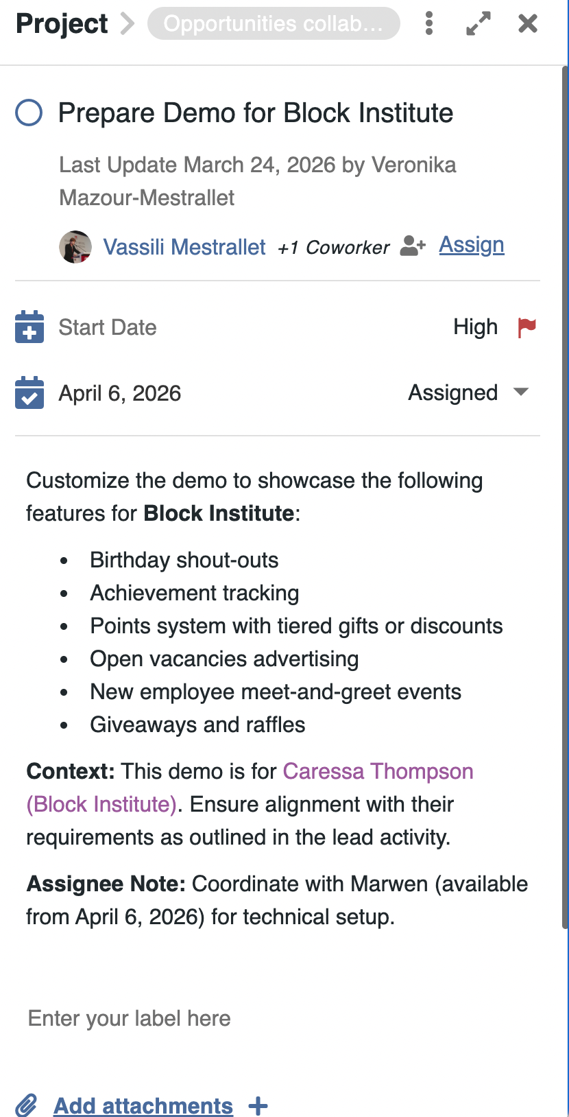 Users can move seamlessly from information to execution, without switching tools. Example of a task creation by AI: