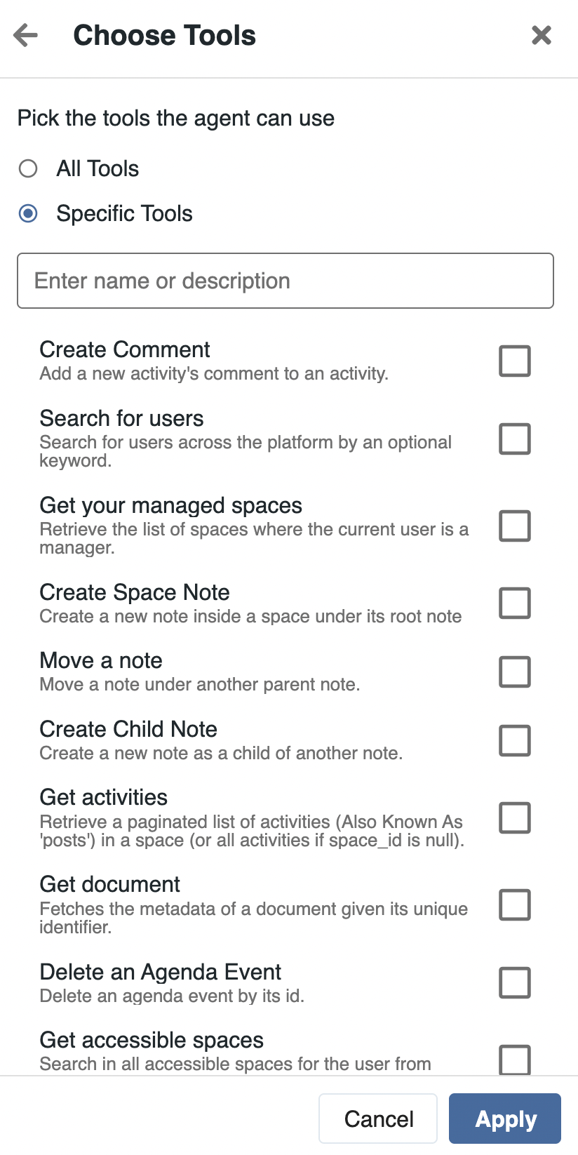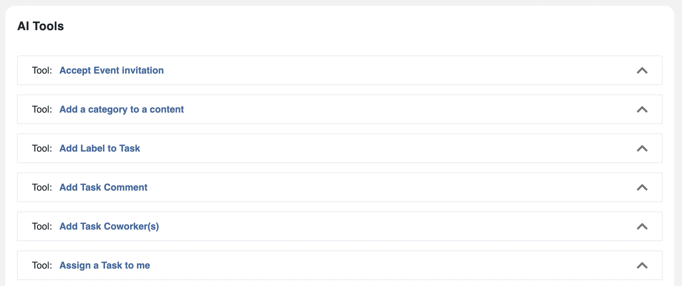 The administrator can access the list of available tools. Agents’ access to tools is configured in the agent configuration interface, in a granular manner.