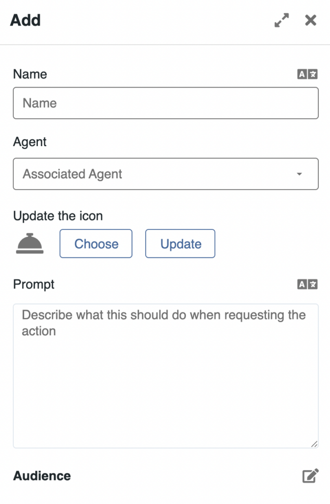 Then for each contextual action point, the administrator will be able to define simple actions and associate an agent and a prompt to those actions: