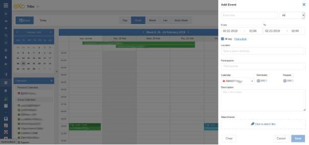La fonctionnalité du calendrier intégré permet aux équipes de planifier leurs réunions en toute simplicité. Le calendrier est directement intégré dans l’application de chat et les événements peuvent y être planifiés directement. Notre dernière version eXo Platform 5.2 a apporté une facilité d’utilisation et un nouveau design aux fonctionnalités du calendrier.