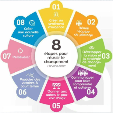 Ce modèle donne au chef de projet les grandes lignes de la conduite du changement et montre qu’il est nécessaire de transformer les collaborateurs résistants au changement en participants actifs par la confiance, la transparence et le travail d’équipe. Dans son livre « how to build adaptive genius in your organization », John Kotter insiste sur l’importance du leadership dans le processus du changement : « une transformation réussie, c’est 70 à 90% de leadership et seulement 10 à 30% de gestion ».