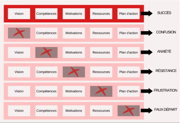 Pour une conduite du changement réussie, 5 composantes sont indispensables selon le modèle de Tim Knoster (expert américain du comportement) :