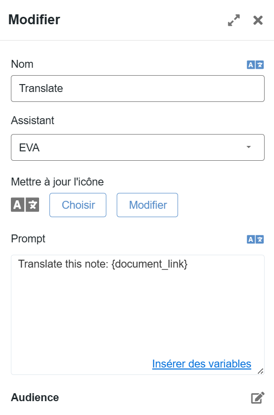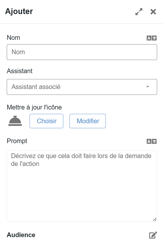 Ensuite, pour chaque point d’action contextuel, l’administrateur pourra définir des actions simples et associer un assistant ainsi qu’un prompt à ces actions :
