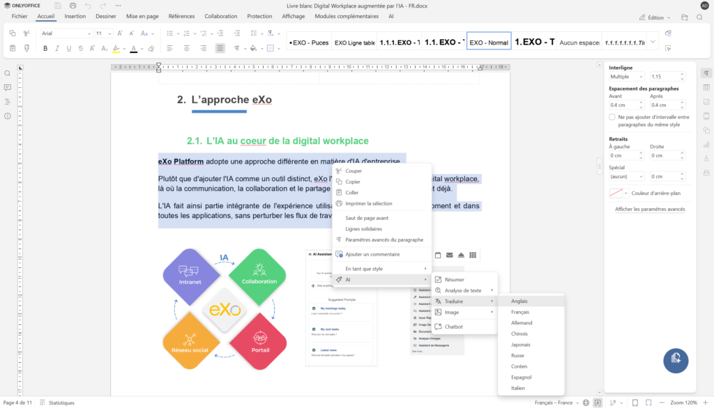 Derrière cet accès unifié, eXo s’appuie sur des assistants IA contextuels. À chaque fois que l’IA est sollicitée :