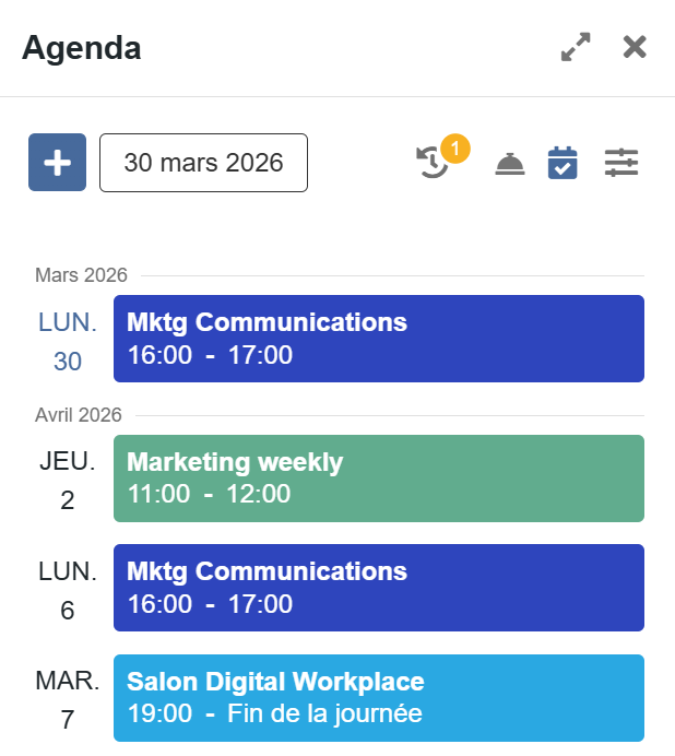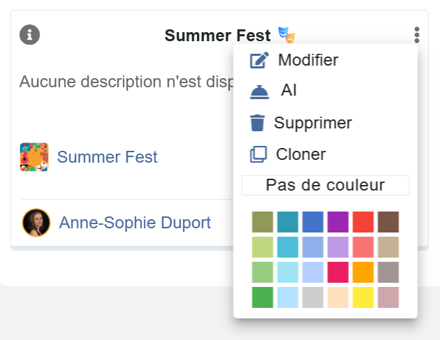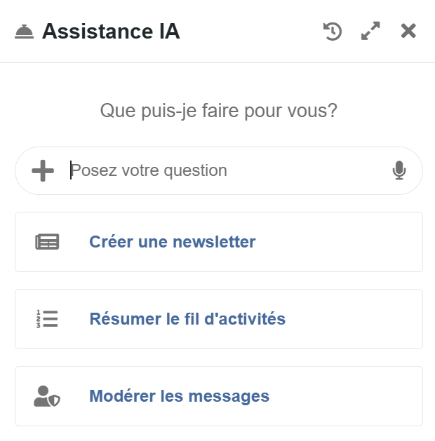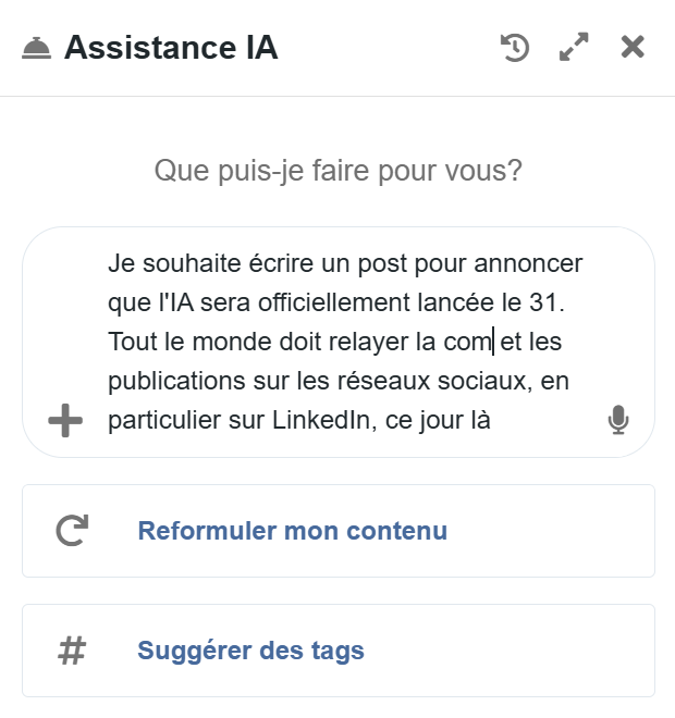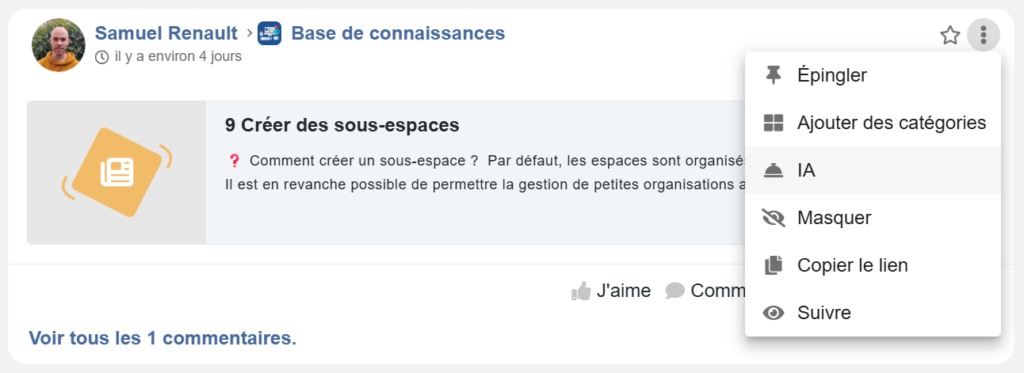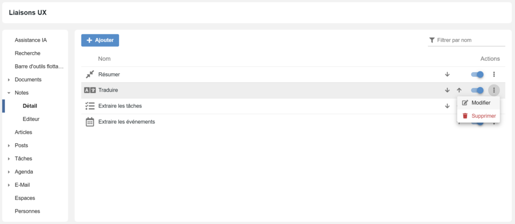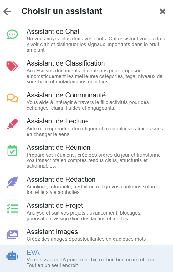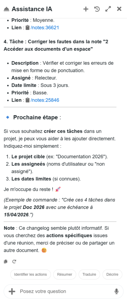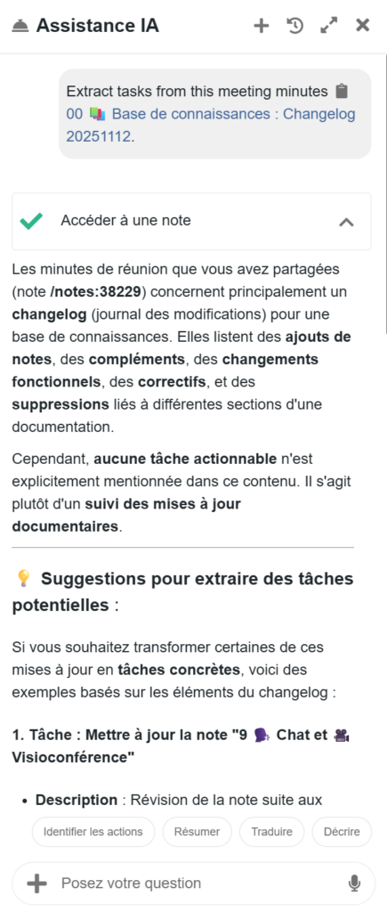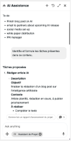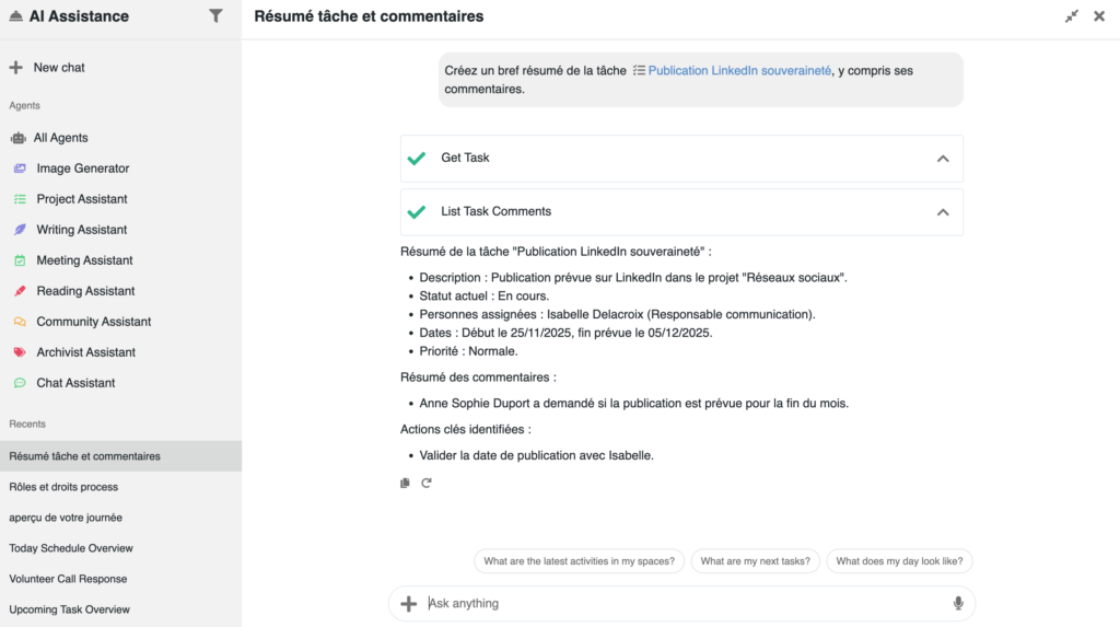 Les assistants IA peuvent être appelés via des actions IA contextuelles, configurées à l’aide de prompts et déclenchées directement sur des éléments spécifiques de la plateforme, tels que des tâches, des documents, des publications ou des événements.