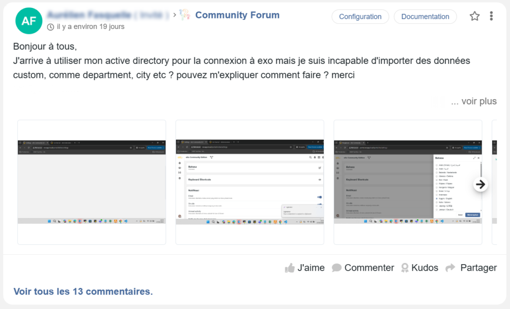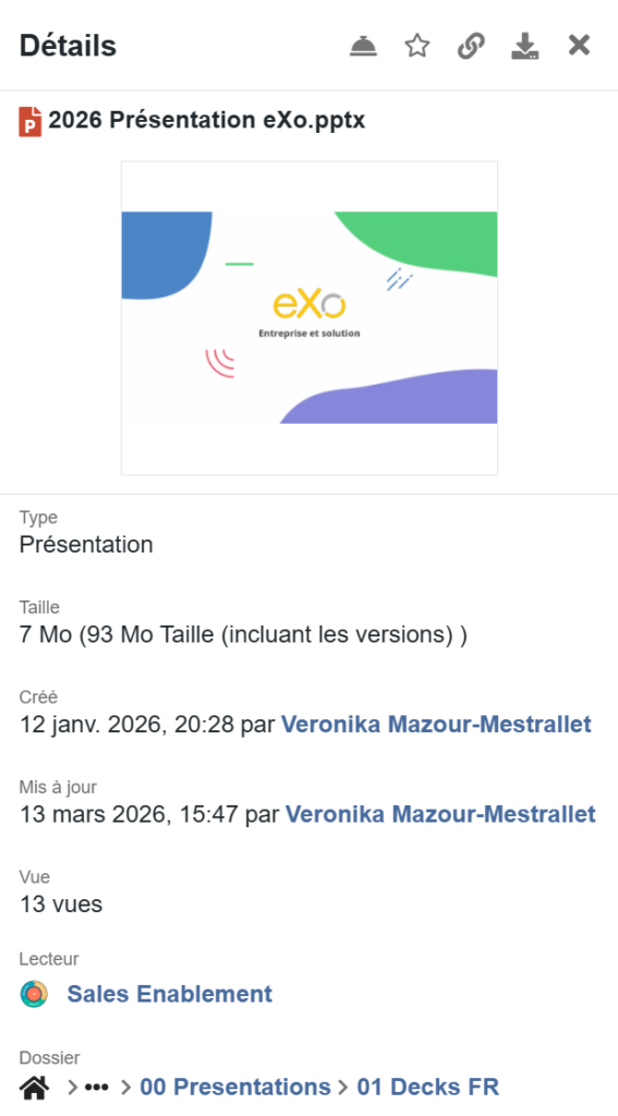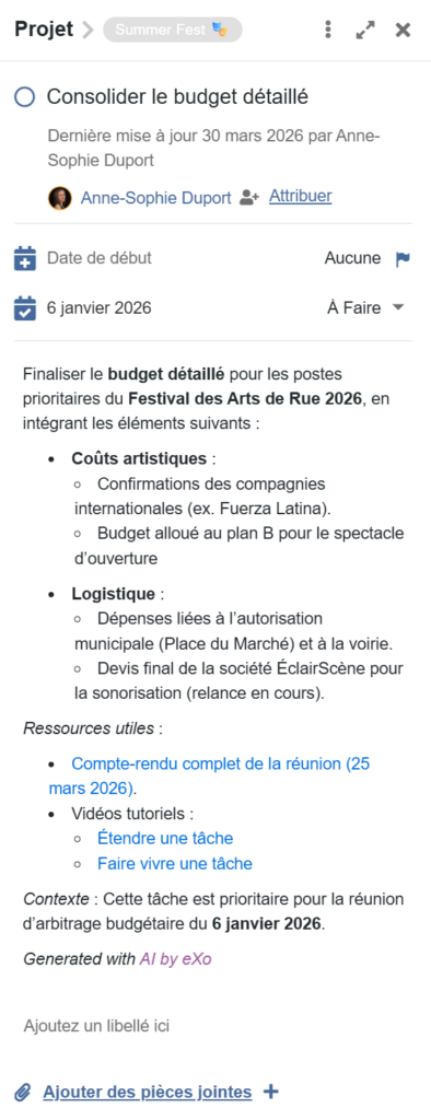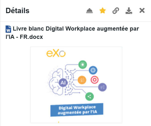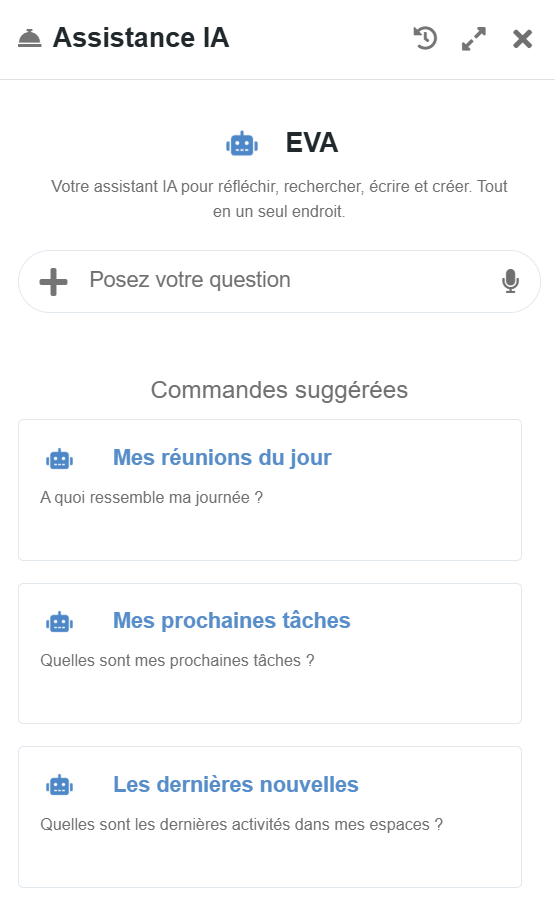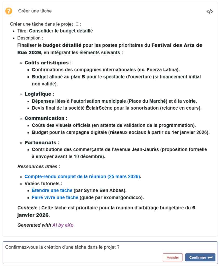 Pour faciliter encore davantage cette tâche, eXo propose des prompts préconfigurés, accessibles d’un simple clic directement dans l’interface et adaptés au contexte de l’utilisateur. En fonction de l’endroit où il se trouve, l’IA suggère des actions pertinentes. Par exemple :