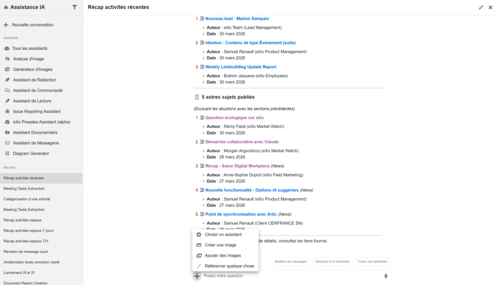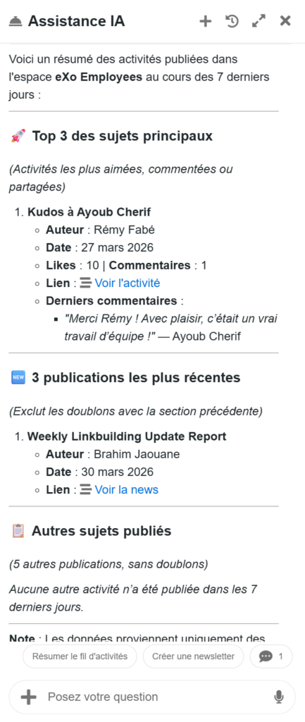 Au-delà de la création de contenu, l’IA d’eXo aide les utilisateurs à naviguer et à donner du sens aux informations sur l’ensemble de la plateforme.