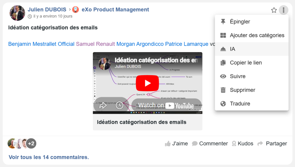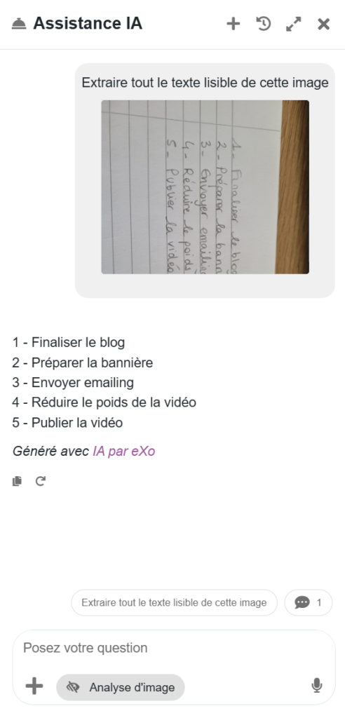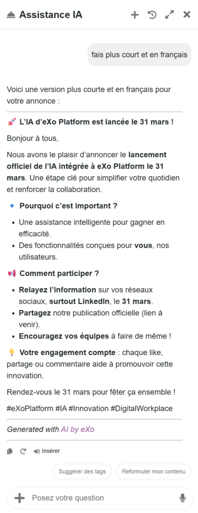 L’IA dans eXo est conçue pour faciliter l’une des activités les plus courantes au travail : la production et le partage de contenu.