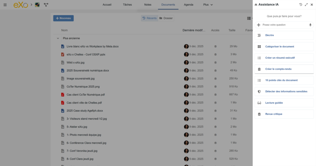 eXo place l’IA au cœur de l’expérience de la digital workplace, en assistant le travail quotidien dans tous les cas d’usage :