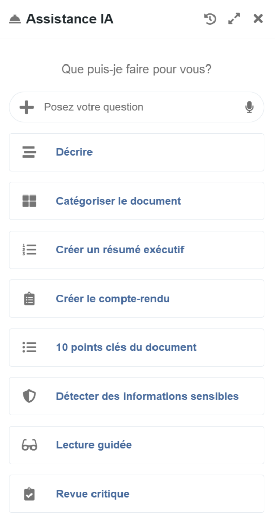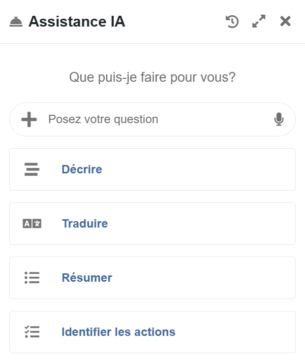 Les utilisateurs peuvent également choisir leur assistant et préciser le contexte dans lequel l’IA doit opérer. La fenêtre IA peut être étendue en plein écran à tout moment, donnant accès à l’historique des conversations et à des fonctionnalités avancées.