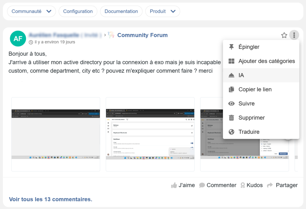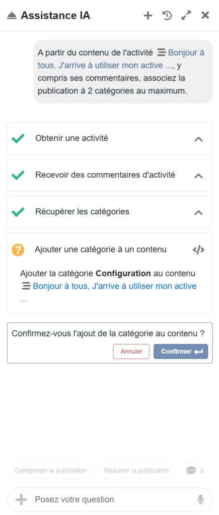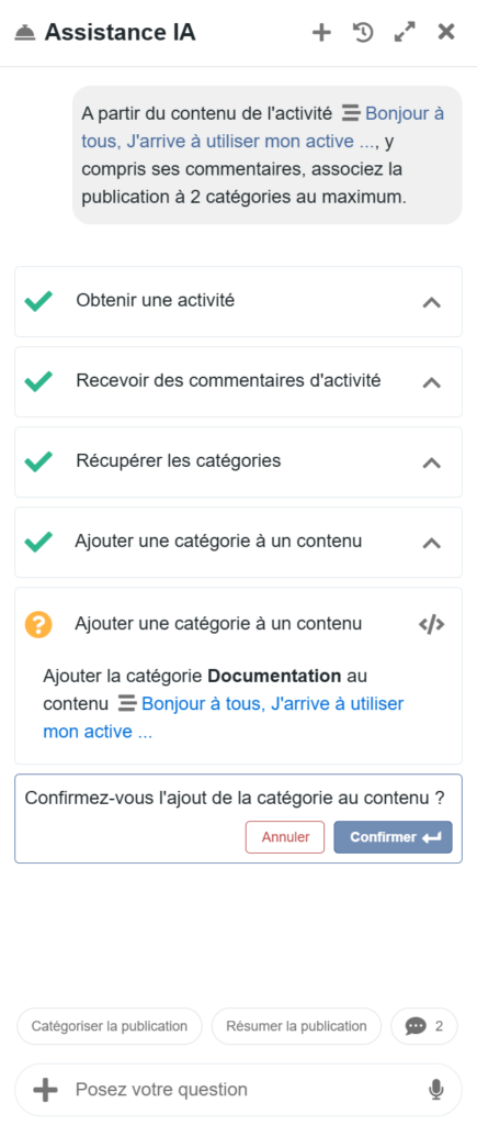 Exemple d’IA analysant, suggérant des catégories et les appliquant à une publication sur un forum :