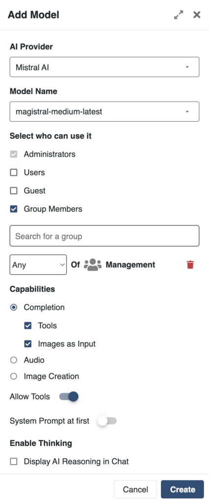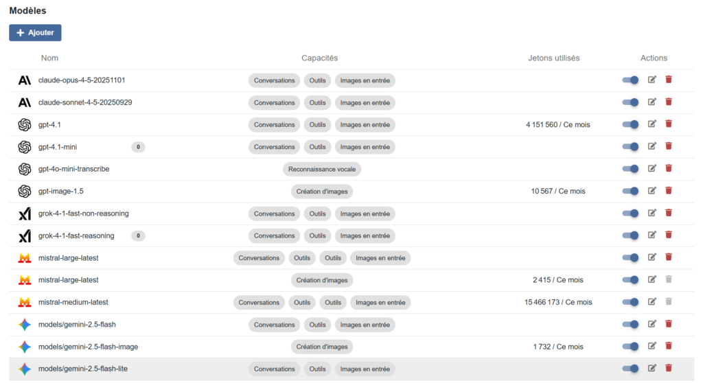 Il est possible de configurer et de gérer plusieurs modèles, y compris des modèles multimodaux capables de traiter du texte, des documents, des images et de la voix.