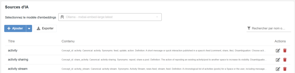 Les modèles embarqués constituent un élément essentiel de la gestion des données, car ils sont utilisés à la fois lors de l’intégration des données et lors de la recherche sémantique sur des contenus potentiellement sensibles. eXo permet par défaut l’utilisation de modèles embarqués auto-hébergés, via Ollama, évitant ainsi toute exposition incontrôlée des données.