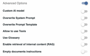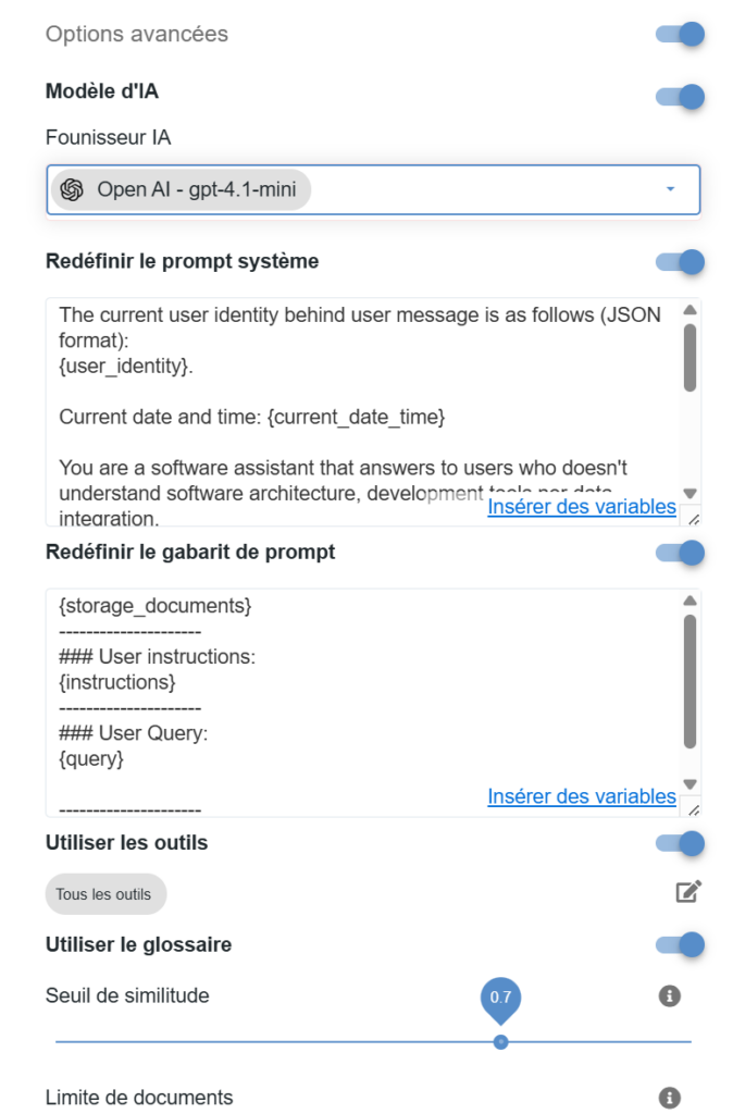 Les options avancées incluent le choix du modèle, les remplacements par défaut et l’accès aux outils.