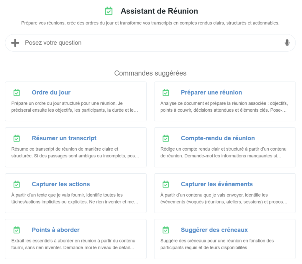 Ces actions permettent aux utilisateurs d’automatiser et de standardiser les flux de travail courants, facilitant ainsi la réalisation de tâches répétitives telles que la création d’ordres du jour structurés pour les réunions, la production de rapports d’activité ou le suivi de l’avancement des projets.