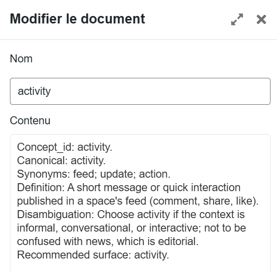 L’IA peut également exploiter des sources de contexte complémentaires pour améliorer la cohérence et la pertinence, en particulier un glossaire organisationnel. Ce dernier peut être géré par l’organisation via l’interface d’administration :