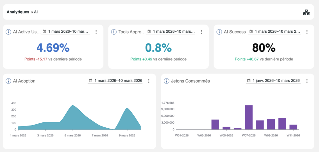 L’utilisation de l’IA peut être tracée grâce aux fonctionnalités d’analyse de la plateforme, au même titre que les autres fonctionnalités.