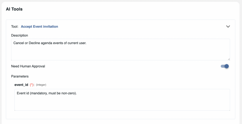 De plus, toutes les actions proposées par l’IA restent sous le contrôle de l’utilisateur. Il peut examiner, ajuster ou valider les résultats avant que toute action ne soit exécutée. Cette validation par l’utilisateur est définie au niveau de l’outil, garantissant ainsi que toute action ayant un impact nécessite son approbation.