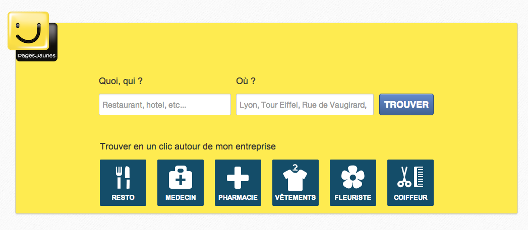 Ça vous paraît familier ? C’est normal, c’est bien pagesjaunes.fr qui est présent avec son fameux “Quoi, qui ?” et “Où ?”. Toute la puissance du moteur de recherche est là. Vous obtenez strictement les mêmes résultats.