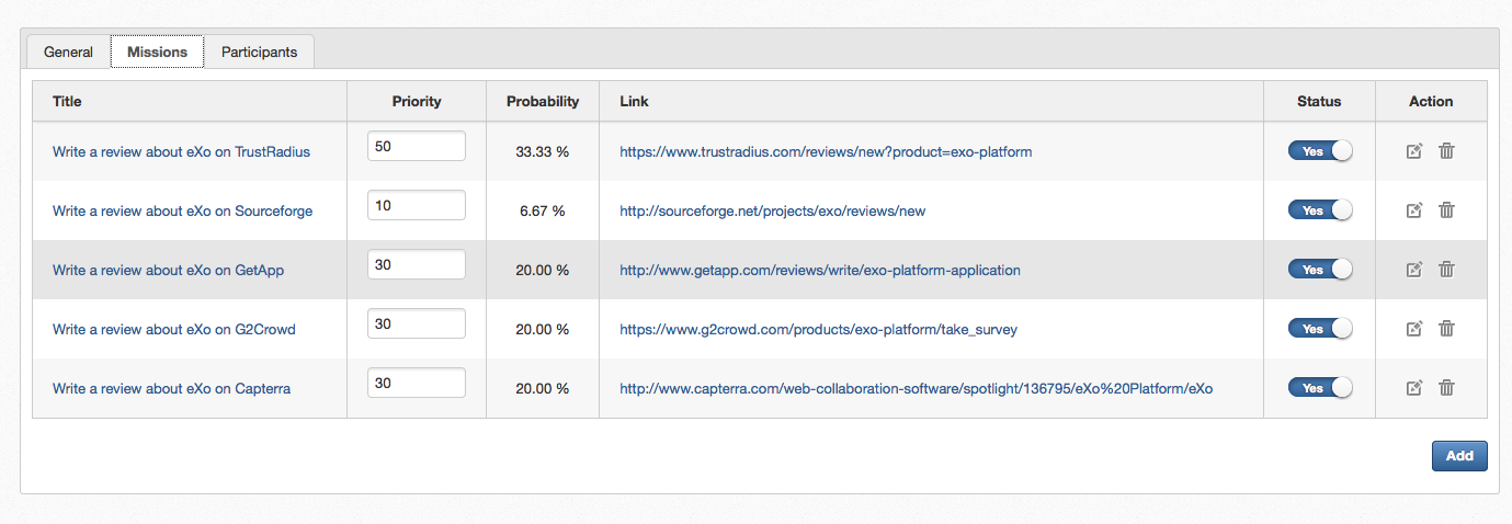 Brand advocacy or referral marketing relies on promoting a brand, products or services through referrals or happy customers. Basically, you encourage your ecosystem to spread the word, tell their story and talk about their experience. The missions model of the add-on has been crafted to match this use case. A mission could be writing a review for your product, capturing a client success story, posting a tweet, shooting some selfies or anything insanely imagined by your marketing guru!